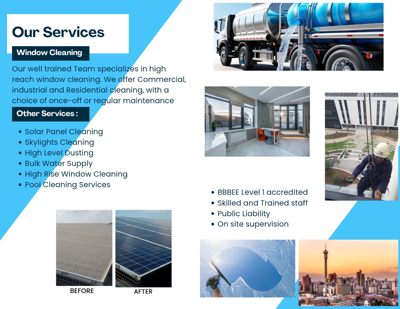 Gauteng Window Cleaning Services is a premier window cleaning company with over 14 years of industry experience. We are dedicated to enhancing the clarity and brilliance of your windows through tailored solutions for both residential and commercial clients. Our commitment to impeccable service, expert techniques, and eco-friendly practices ensures superior results for every project we undertake.